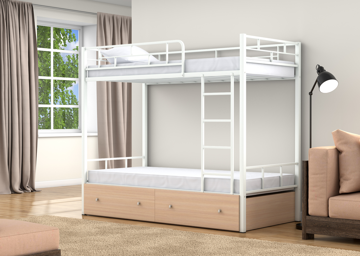 Спальные места 90х190 см., прочный стальной каркас, покрашен безопасной не имеющей запаха порошковой краской. Цвета на выбор: коричневый, черный, слоновая кость. Дополнительно комплектуется выдвижными ящиками и навесной полкой, материал ЛДСП 16 мм., цвета на выбор: дуб молочный или венге.