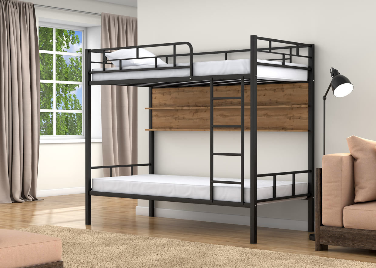Спальные места 90х190 см., прочный стальной каркас, покрашен безопасной не имеющей запаха порошковой краской. Дополнительно комплектуется выдвижными ящиками и навесной полкой, материал ЛДСП 16 мм.