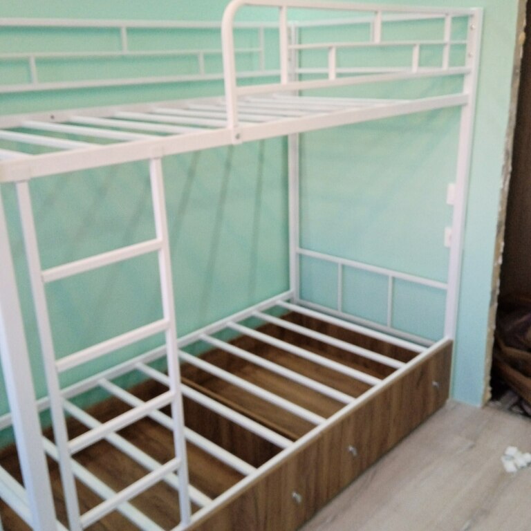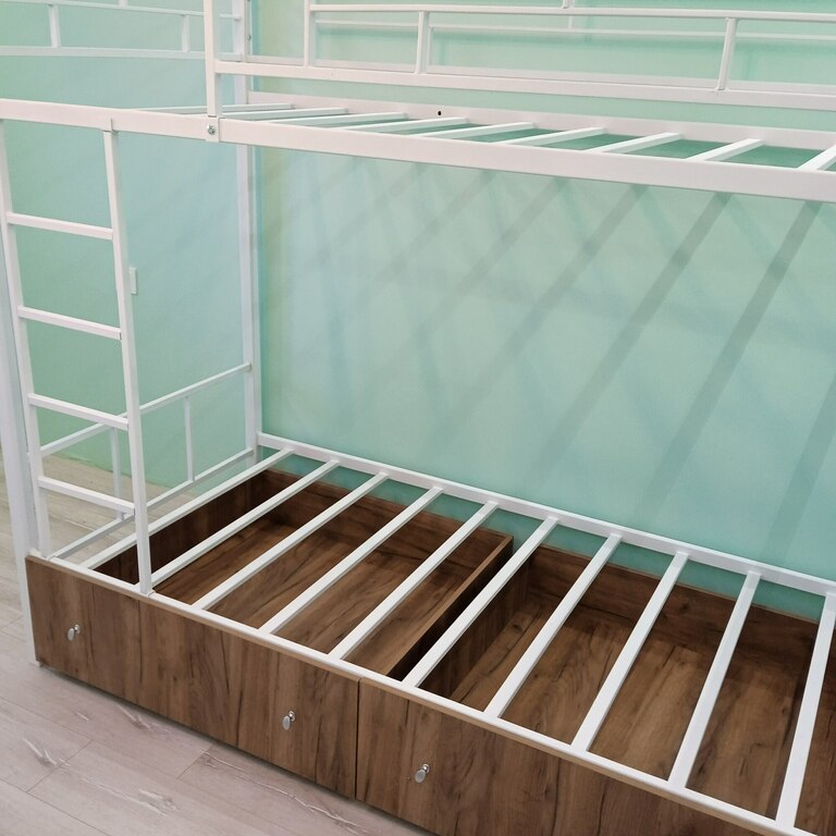Спальные места 90х190 см., прочный стальной каркас, покрашен безопасной не имеющей запаха порошковой краской. Дополнительно комплектуется выдвижными ящиками и навесной полкой, материал ЛДСП 16 мм.