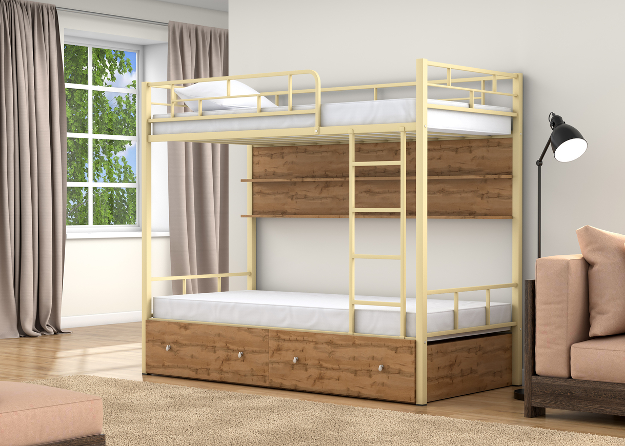 Спальные места 90х190 см., прочный стальной каркас, покрашен безопасной не имеющей запаха порошковой краской. Цвета на выбор: коричневый, черный, слоновая кость. Дополнительно комплектуется выдвижными ящиками и навесной полкой, материал ЛДСП 16 мм., цвета на выбор: дуб молочный или венге.