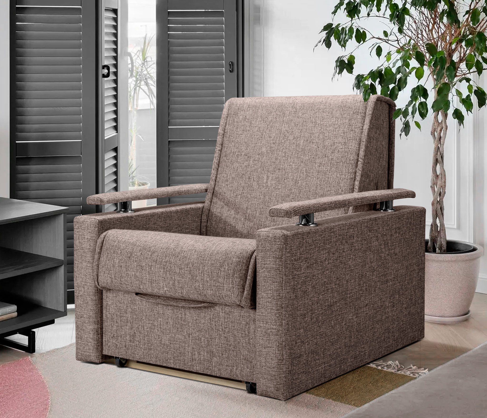Обивка кресла-кровати выполнено в качественной рогожке.
