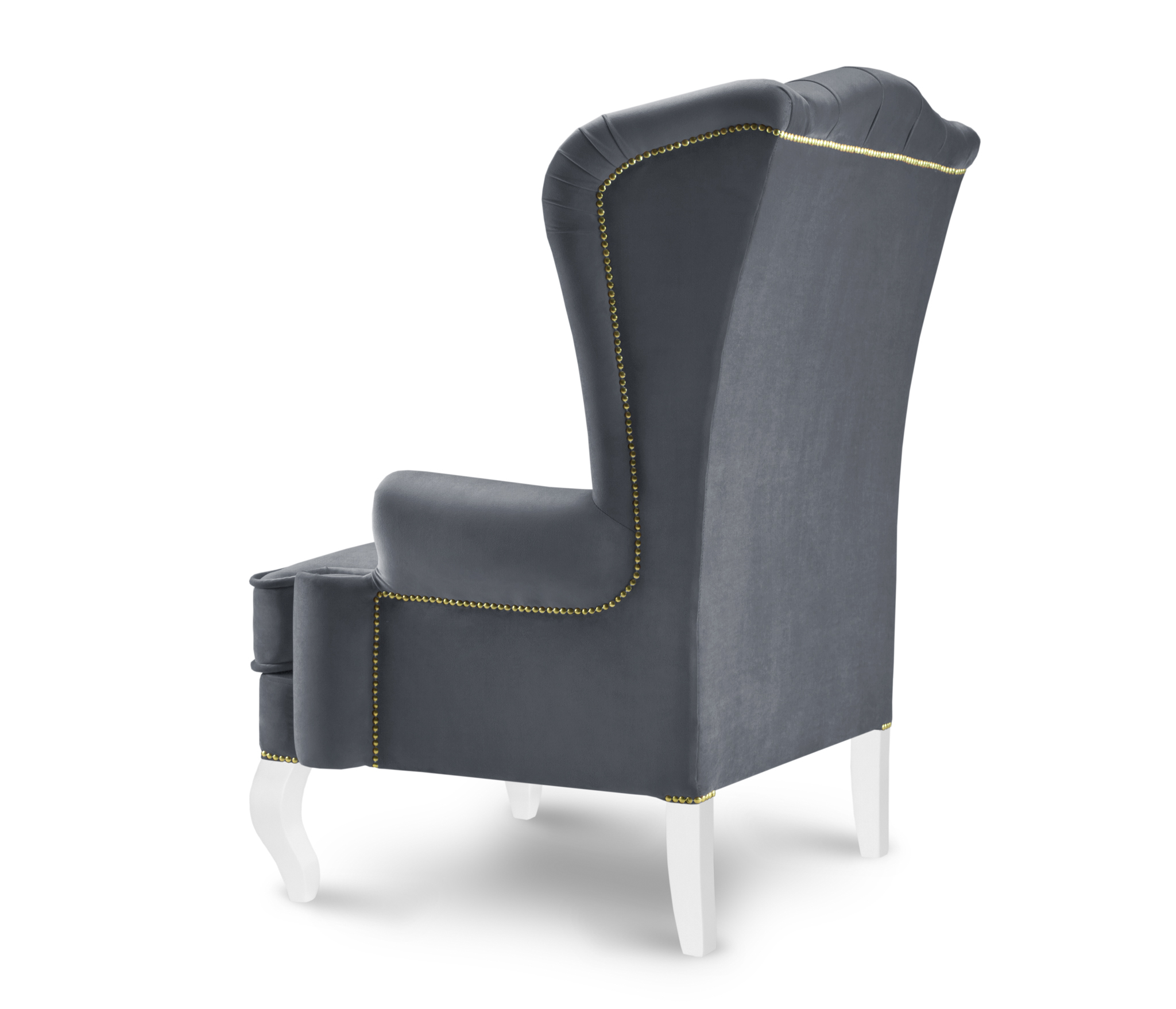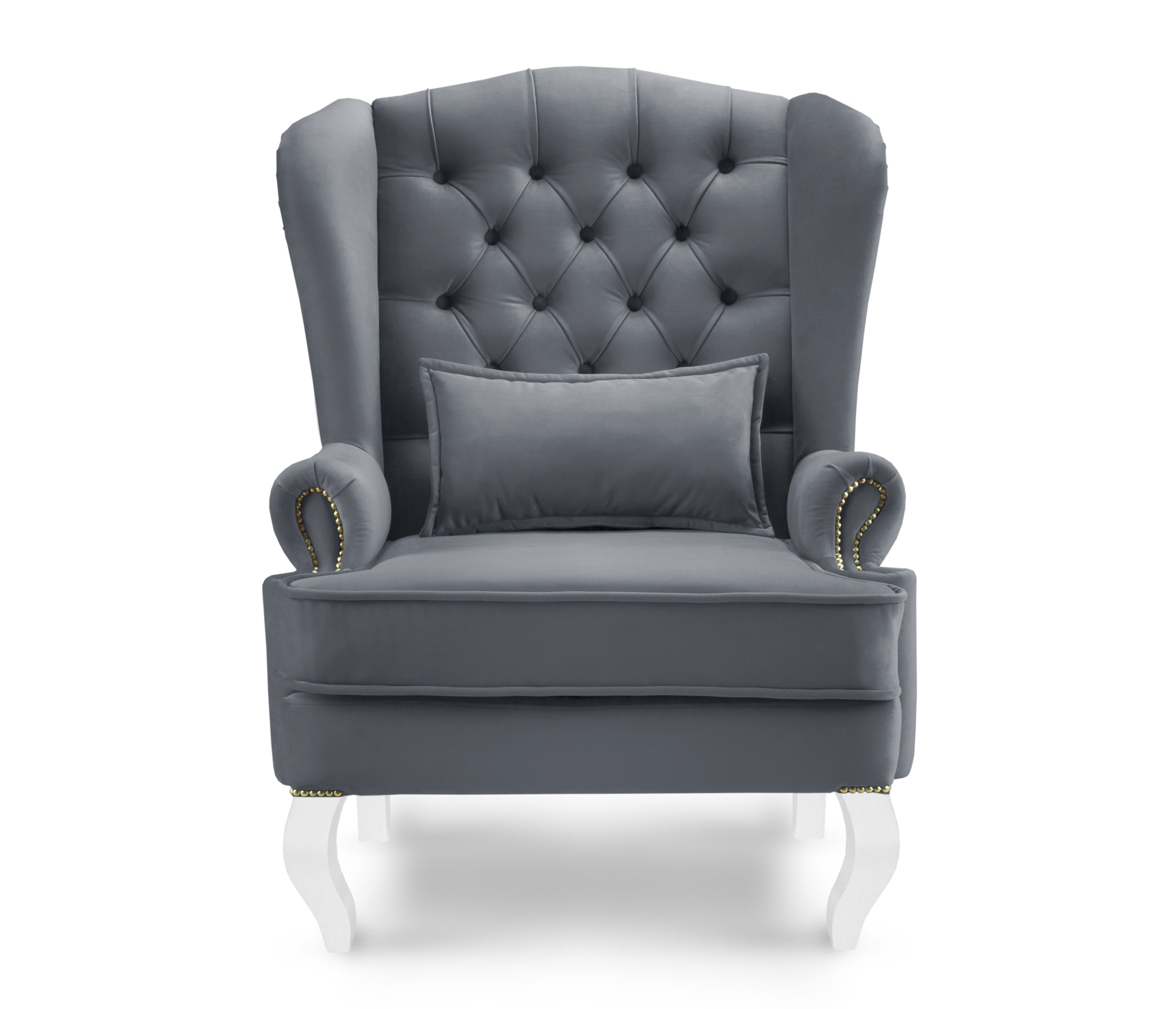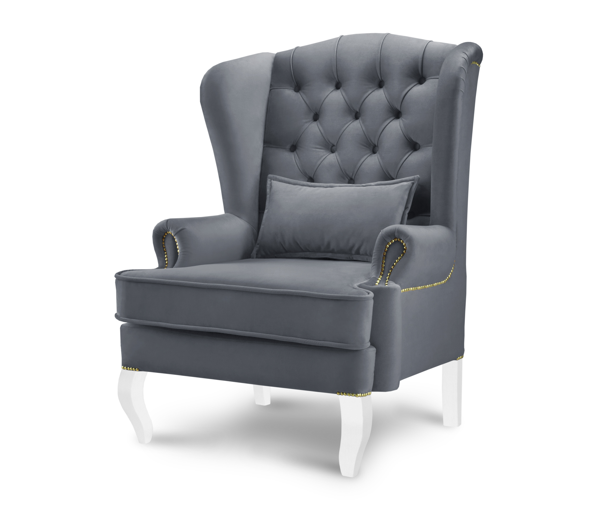 Высокая спинка кресла украшена каретной стяжкой и декорирована пуговицами.