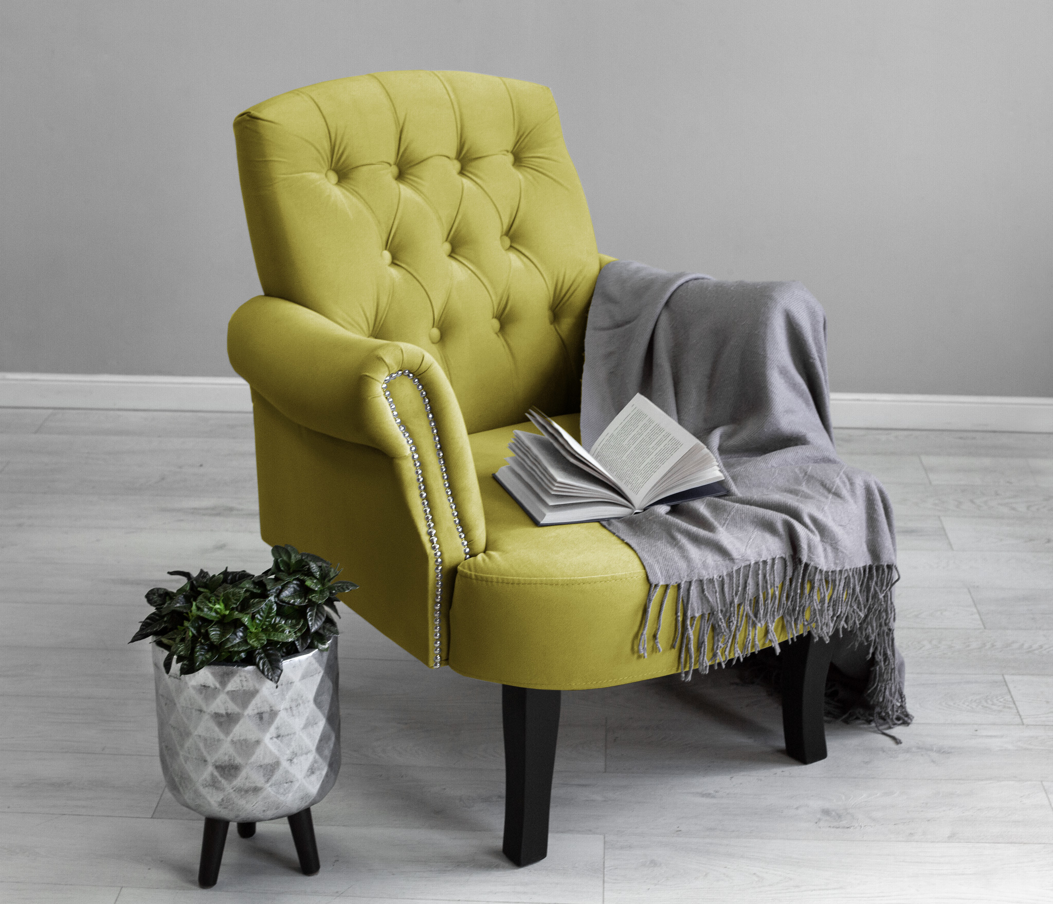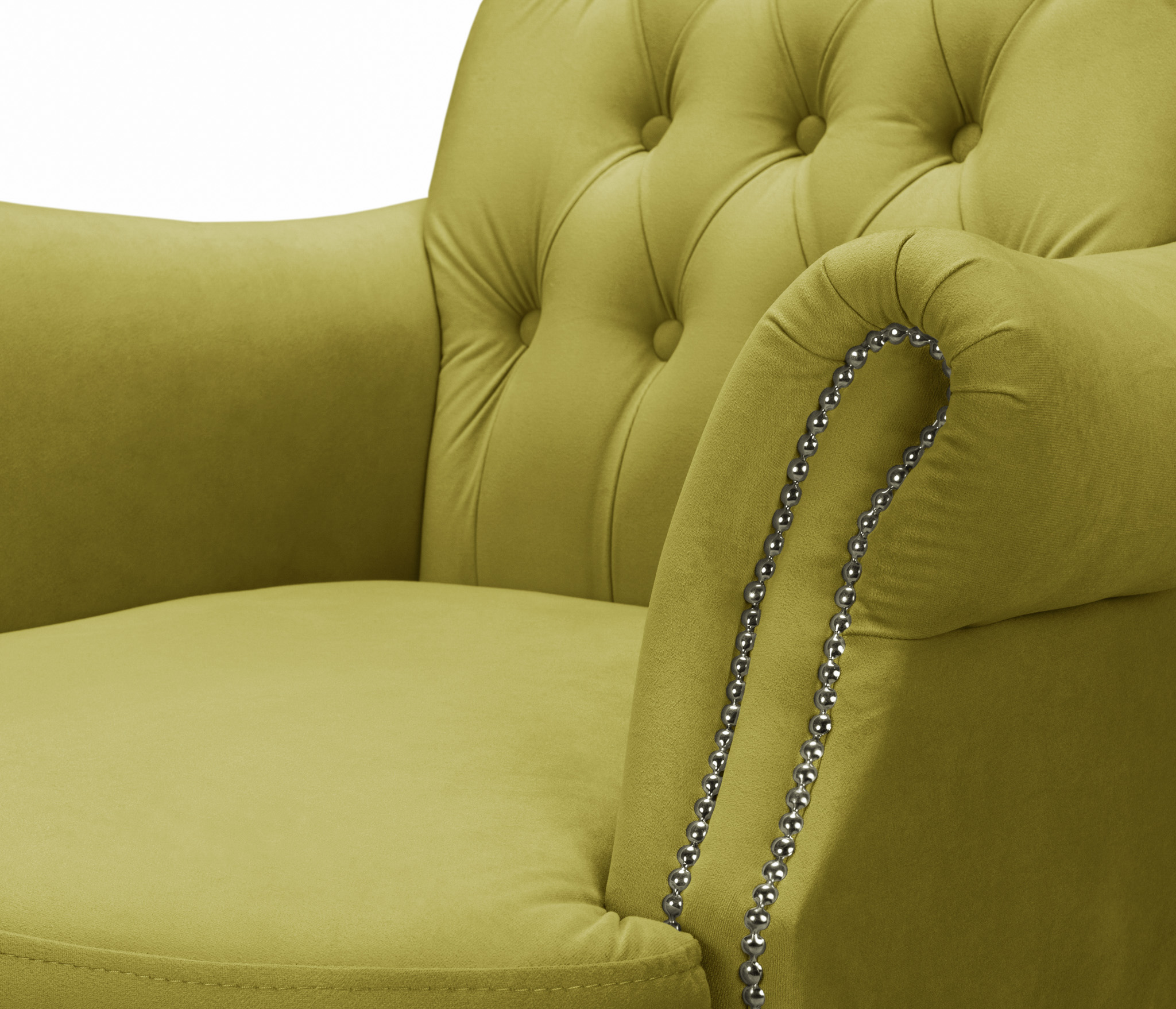 Спинка с деликатным наклоном для большего комфорта украшена каретной стяжкой и декорирована пуговицами.