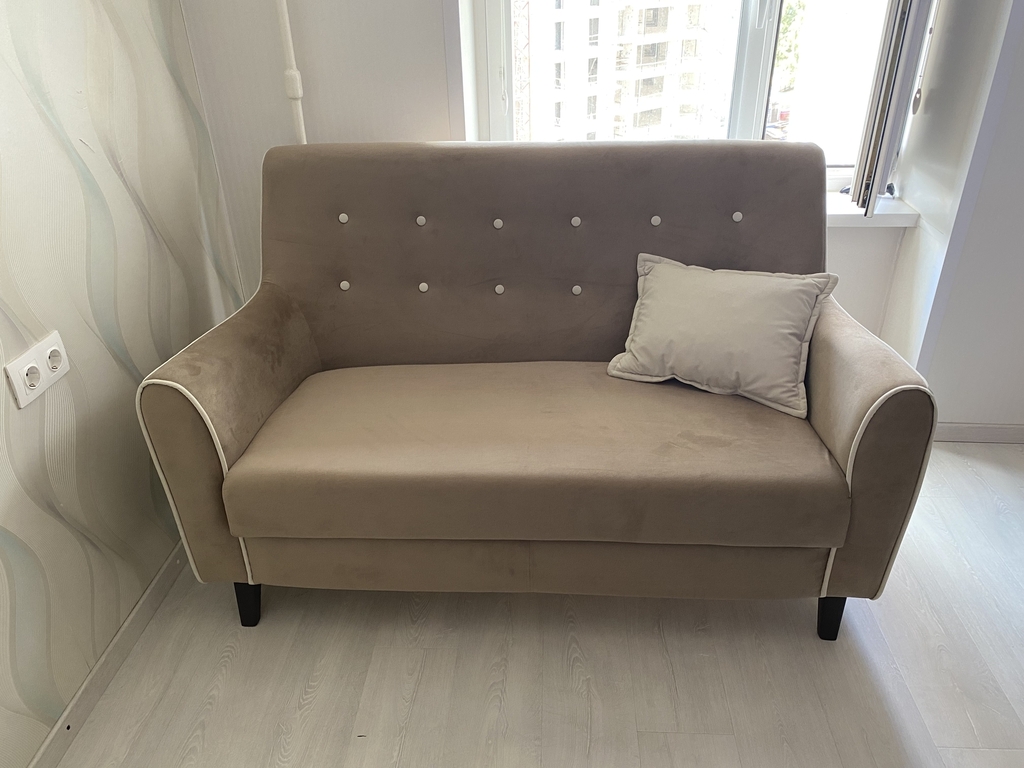 Диван Муссон выполнен в качественной обивке микровелюр, с высокими техническими характеристиками. Спинка украшена пуговицами.