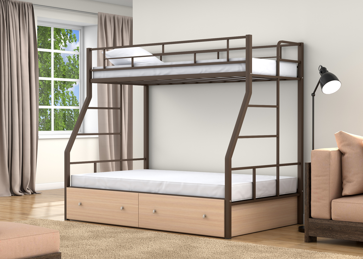 Двухъярусная кровать Раута Твист, спальные места 90х190 см. и 120х190 см., прочный стальной каркас, покрашен безопасной не имеющей запаха порошковой краской. Цвета на выбор: коричневый, черный, слоновая кость. Дополнительно комплектуется выдвижными ящиками и навесной полкой, материал ЛДСП 16 мм., цвета на выбор: дуб молочный или венге.
