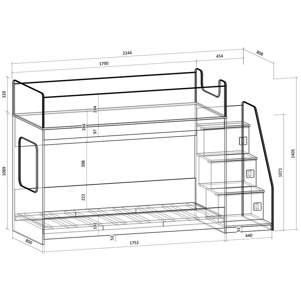 Высота кровати – всего 1405 мм.Удобно - взрослый может заправить кровать,не забираясь на второй ярус.