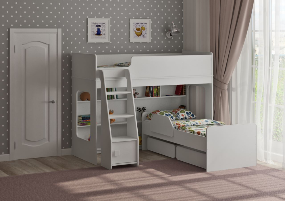 Под верхним спальным местом располагается стеллаж,отлично подходящий для хранения игрушек.