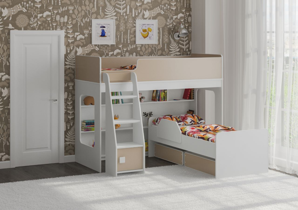 Под верхним спальным местом располагается стеллаж,отлично подходящий для хранения игрушек.