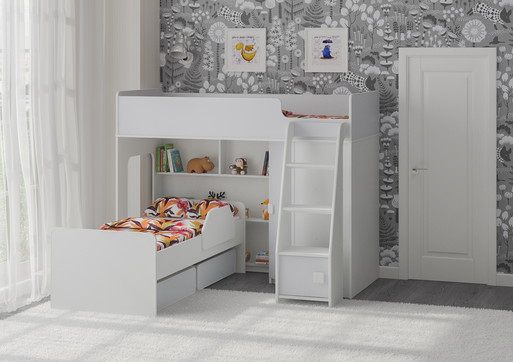 Под верхним спальным местом располагается стеллаж,отлично подходящий для хранения игрушек.