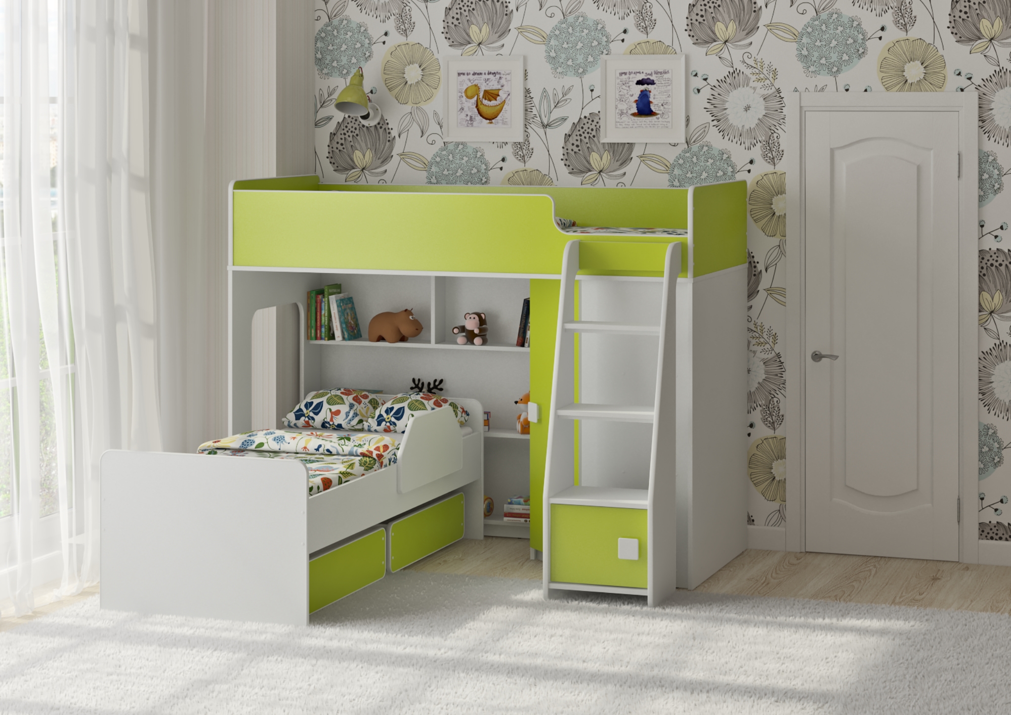 Под верхним спальным местом располагается стеллаж,отлично подходящий для хранения игрушек.