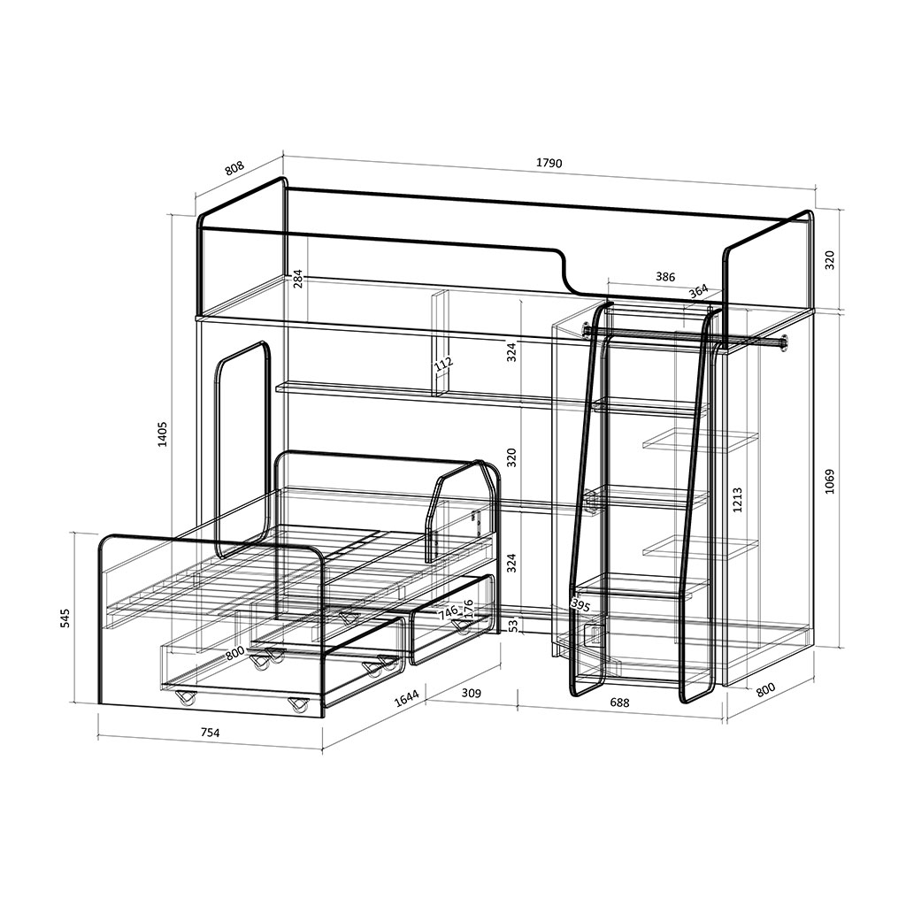 Двухъярусная кровать двумя перпендикулярными спальными местами - 1750х750 и 1600х700 мм.