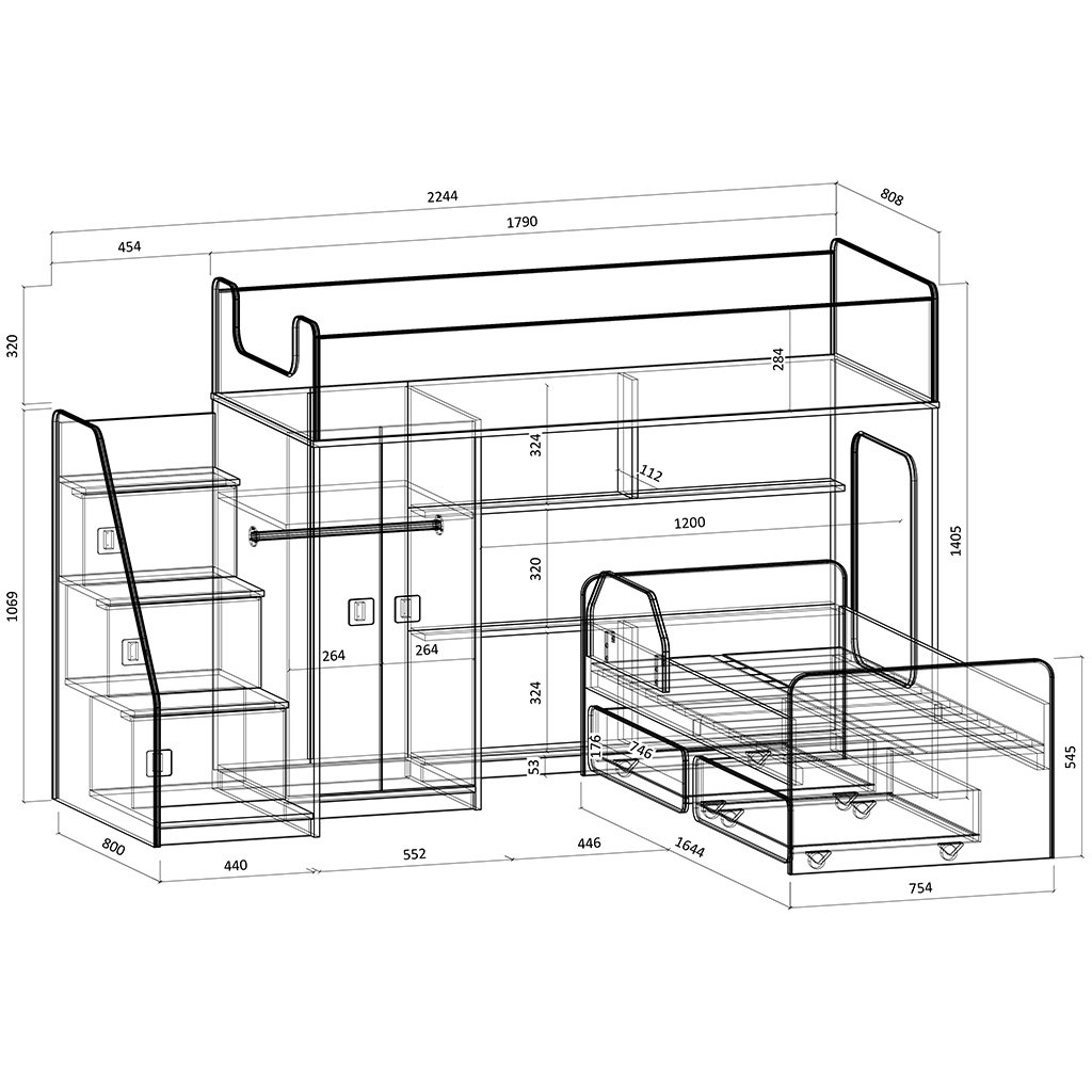 Двухъярусная кровать двумя перпендикулярными спальными местами - 1750х750 и 1600х700 мм.