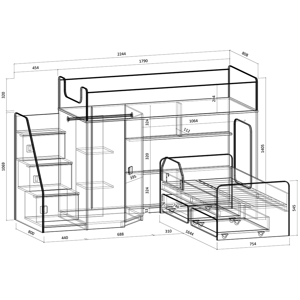 Двухъярусная кровать двумя перпендикулярными спальными местами - 1750х750 и 1600х700 мм.