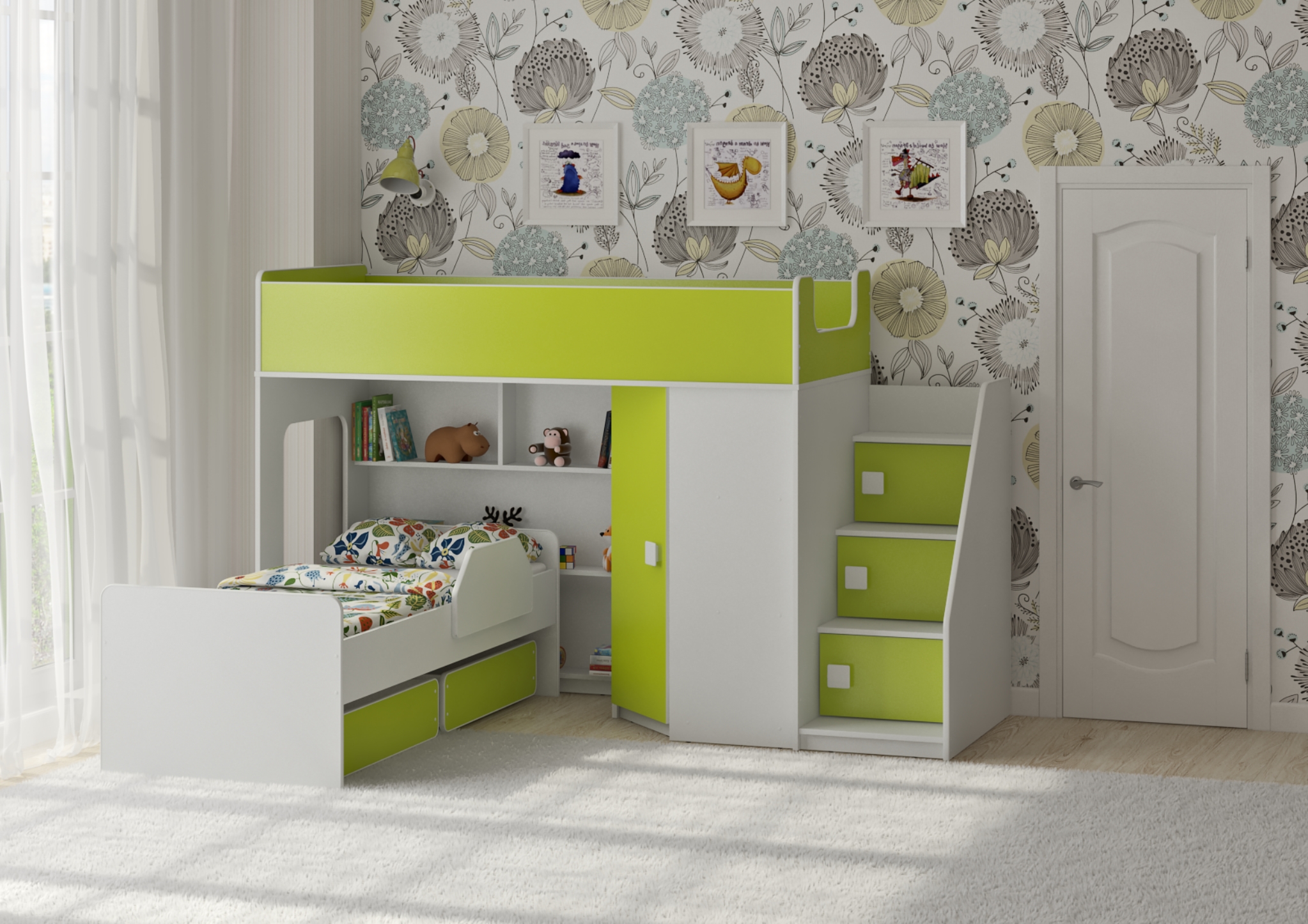 Под верхним спальным местом располагается стеллаж, отлично подходящий для хранения игрушек.
