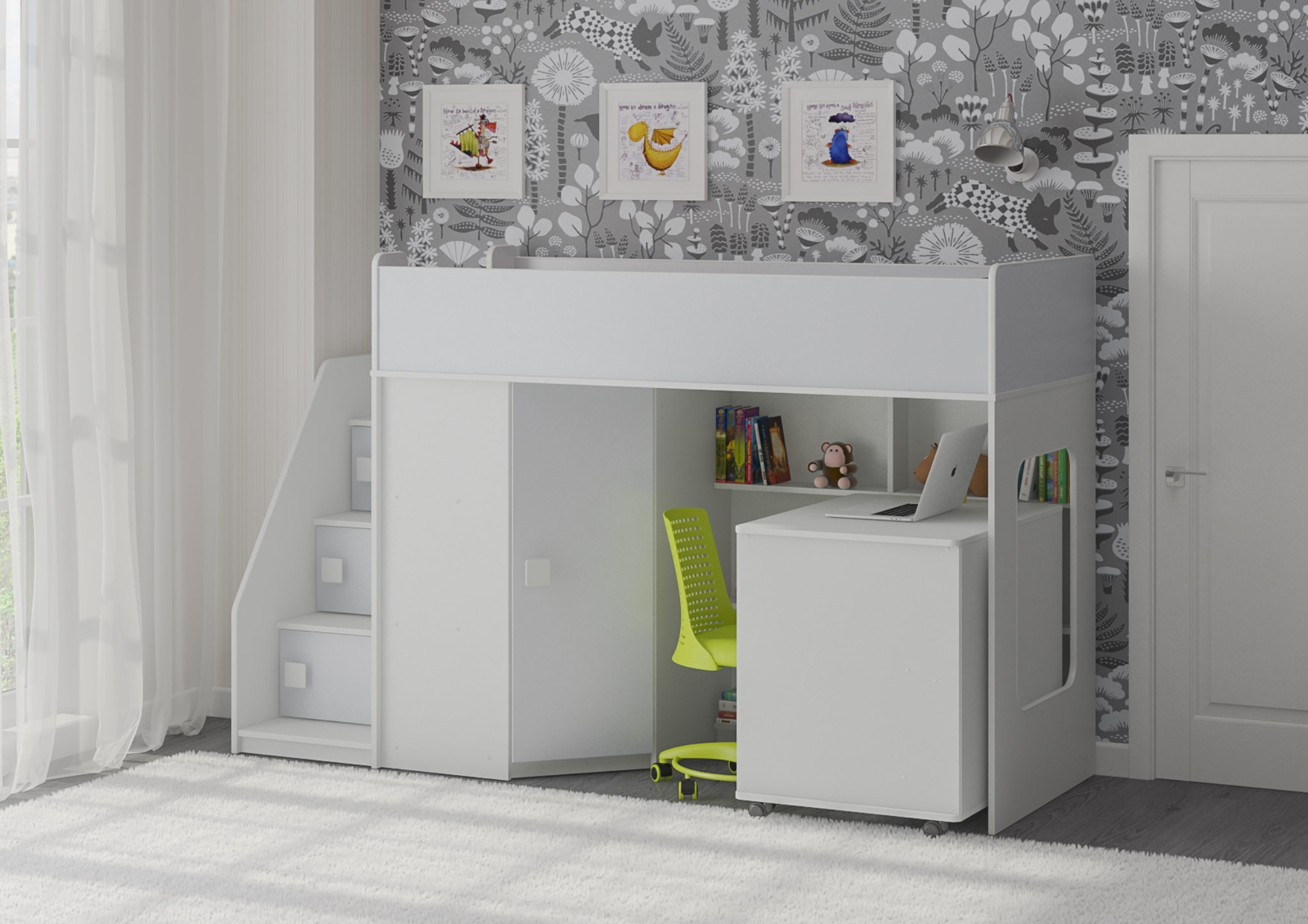 Внизу располагается игровая зона с полками – свой уголок для ребенка.