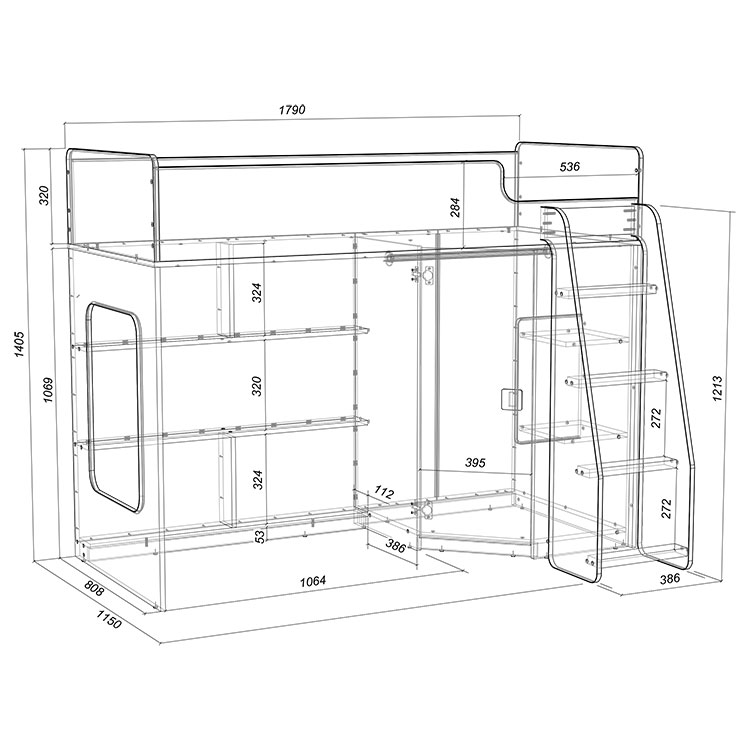 Высота кровати чердака всего 1405 мм, что легко позволит взрослым наблюдать за ребенком на кровати или достать что-то с верхнего яруса.