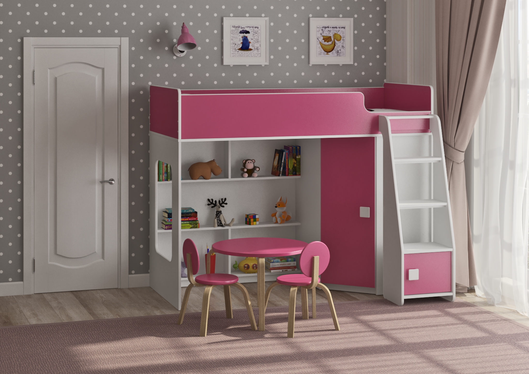 Внизу располагается игровая зона с полками – свой уголок для ребенка.