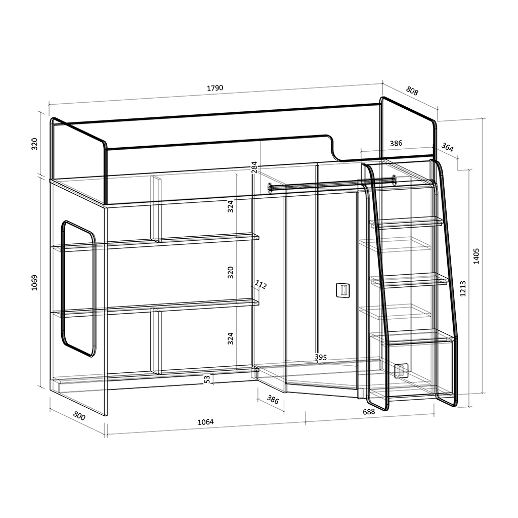 Высота чердака всего 1405мм, что легко позволит взрослым наблюдать за ребенком на кровати или достать что-то с верхнего яруса.