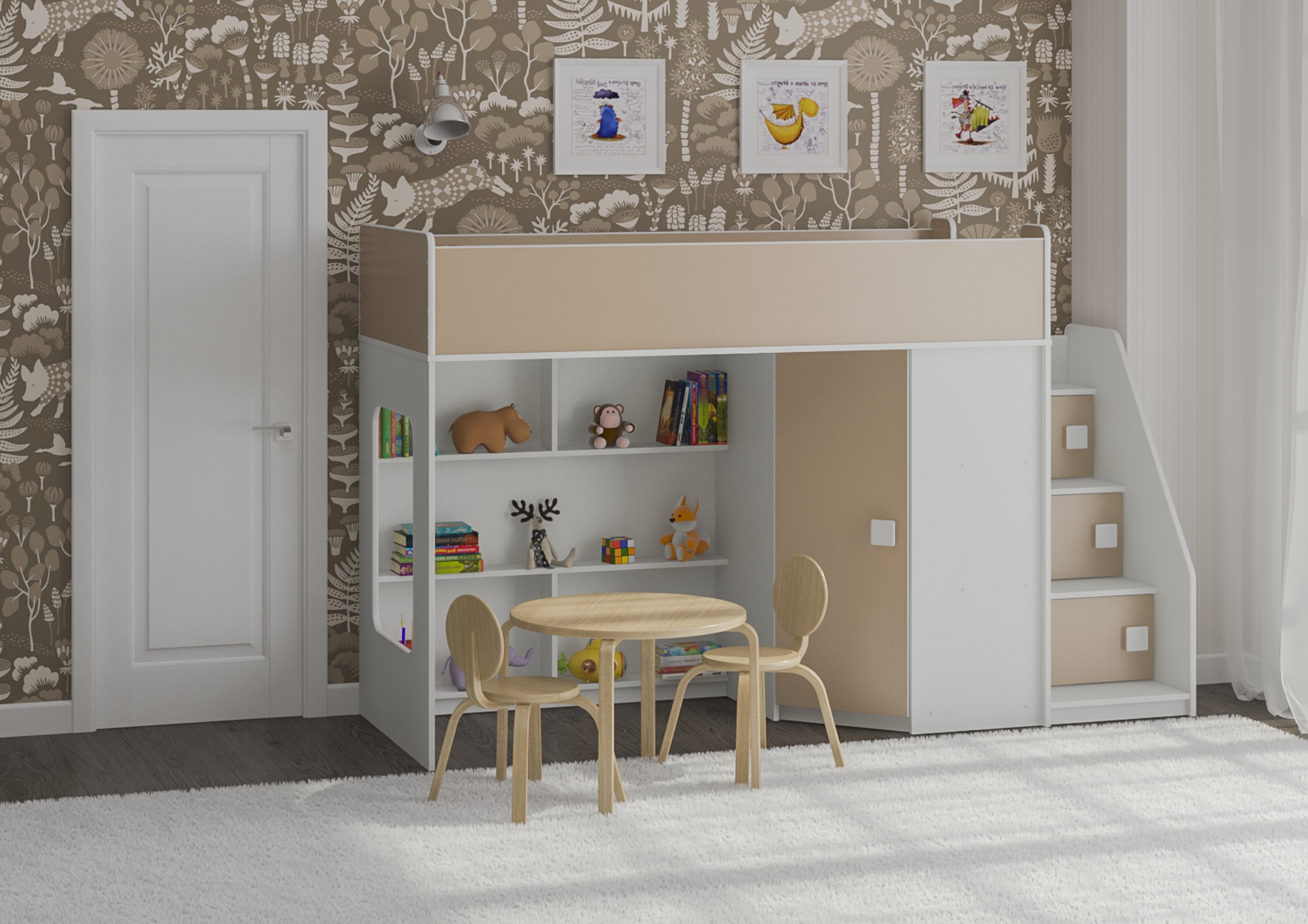 Внизу располагается игровая зона с полками – свой уголок для ребенка.