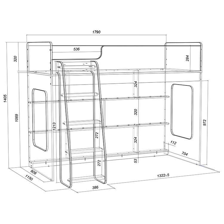 Высота чердака всего 1405мм, что легко позволит взрослым наблюдать за ребенком на кровати или достать что-то с верхнего яруса.