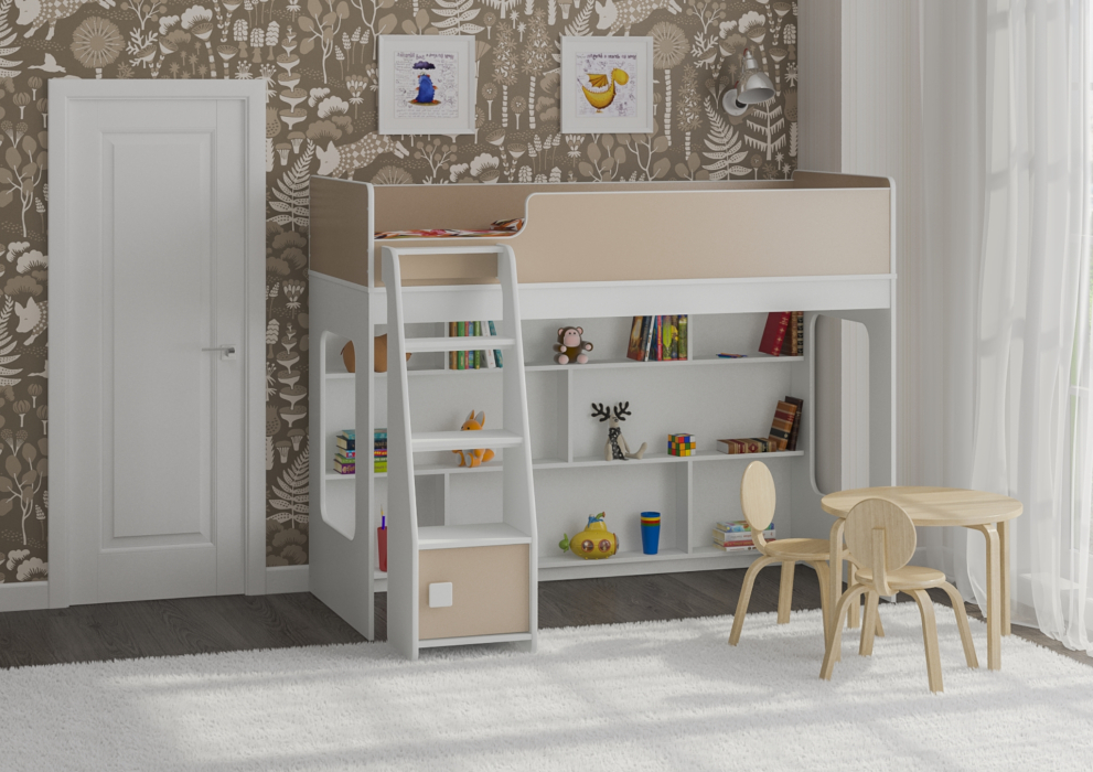Внизу располагается игровая зона с полками – свой уголок для ребенка.
