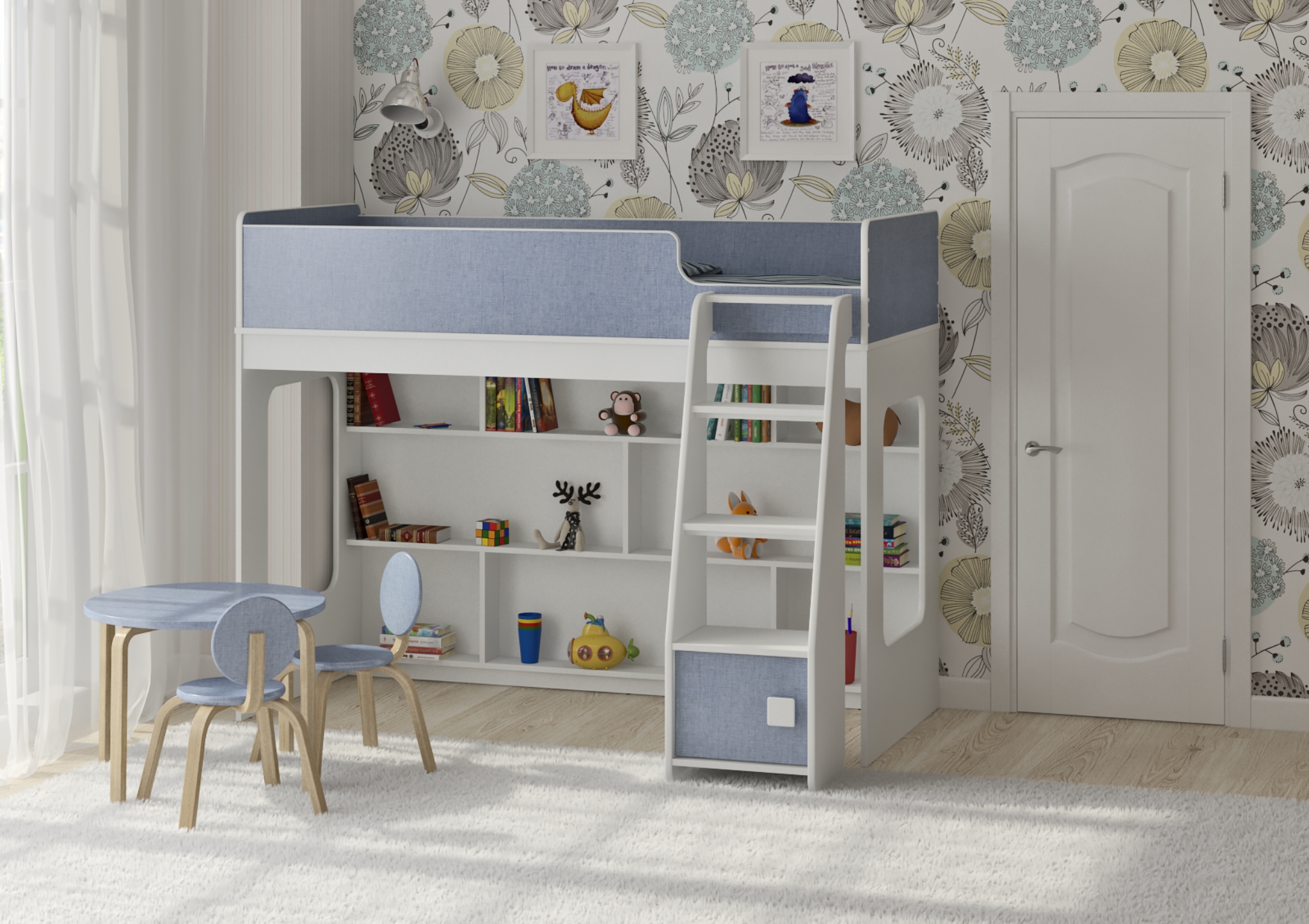 Внизу располагается игровая зона с полками – свой уголок для ребенка.