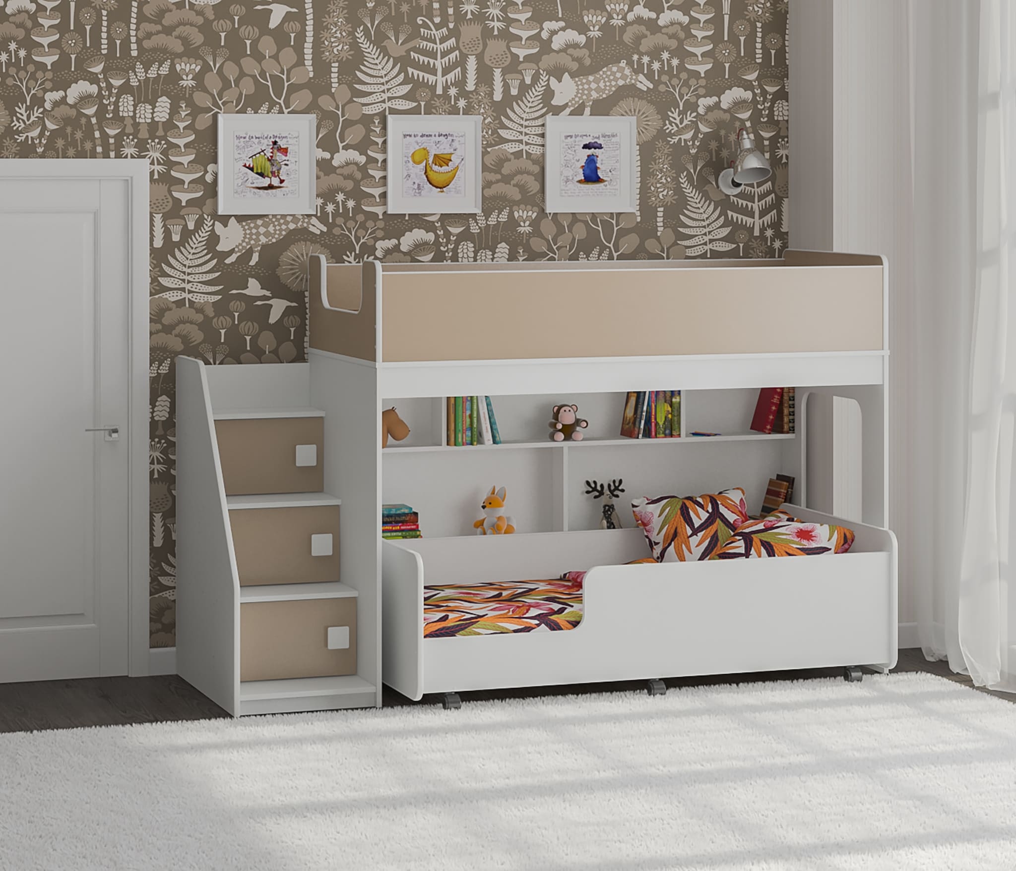 Под верхним спальным местом располагается стеллаж, отлично подходящий для хранения игрушек.