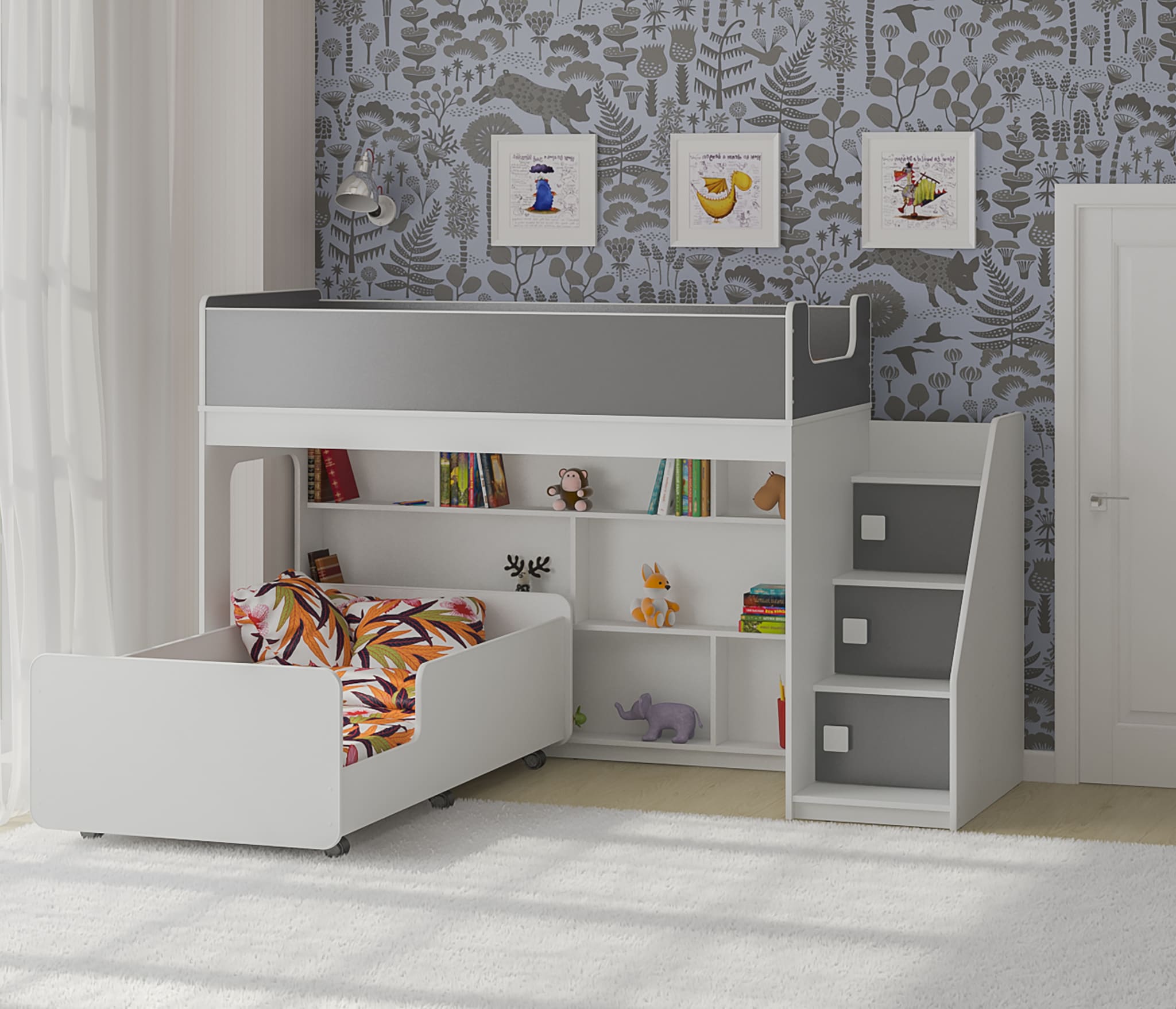 Под верхним спальным местом располагается стеллаж, отлично подходящий для хранения игрушек.