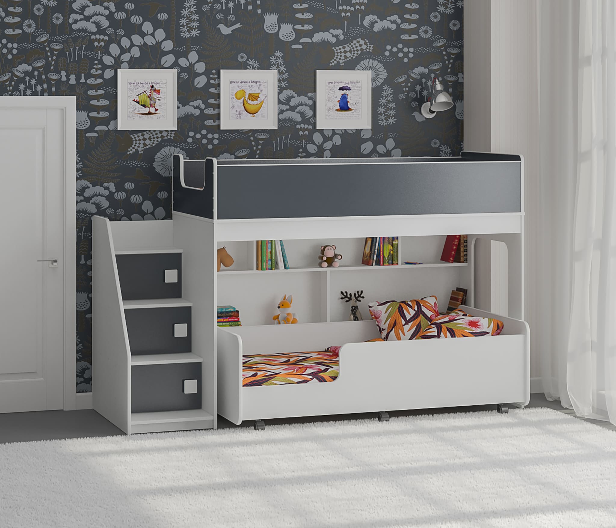 Под верхним спальным местом располагается стеллаж, отлично подходящий для хранения игрушек.