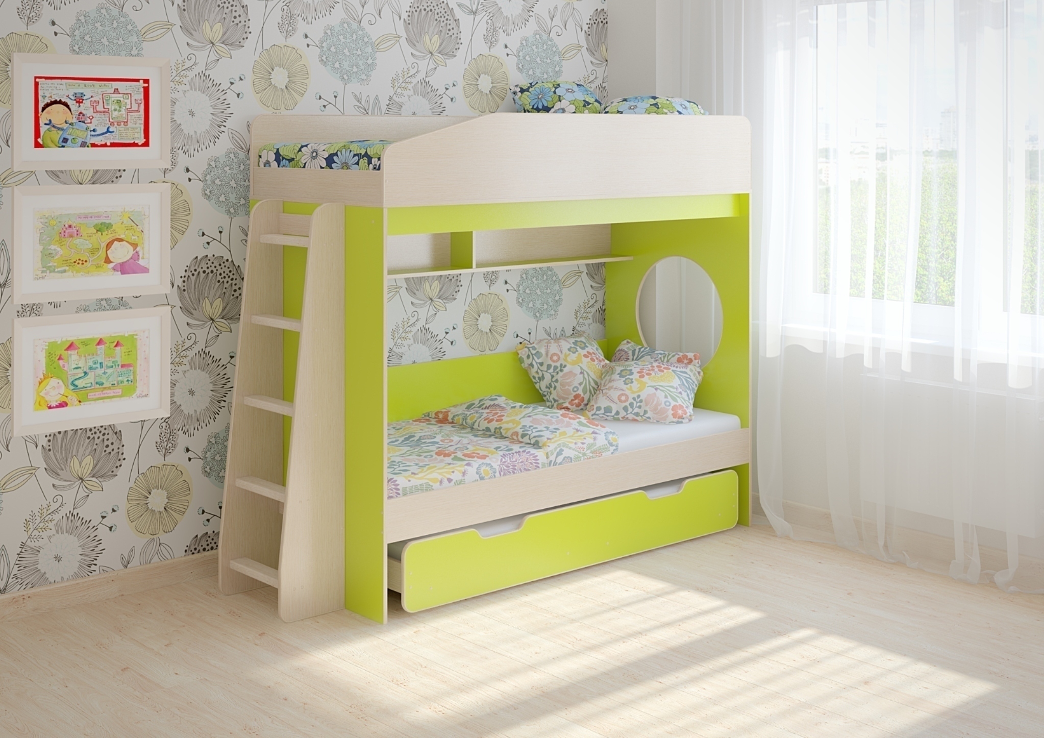 Нижнее спальное место легко выдвигается и задвигается, ребенок сможет управляться с ним. Для данного ящика использованы усиленные колёса, в составе 6 колёс и 3 тормоза. Благодаря колёсам ящик удобно выкатывается и закатывается, благодаря тормозам ящик остаётся недвижим, например, во время ночного сна.