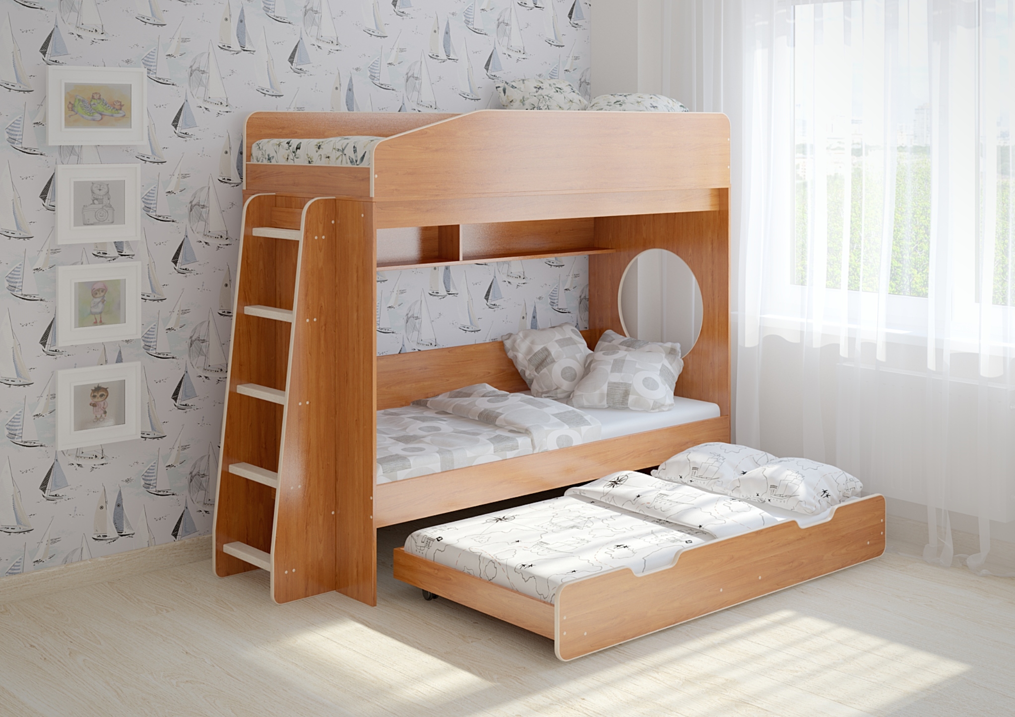 Третье спальное место 1600х800 выдвижной ярус - представлен большим выкатным ящиком, спроектированным таким образом, что может быть использован и как ящик для хранения вещей, и как отдельное спальное место 1600х800!