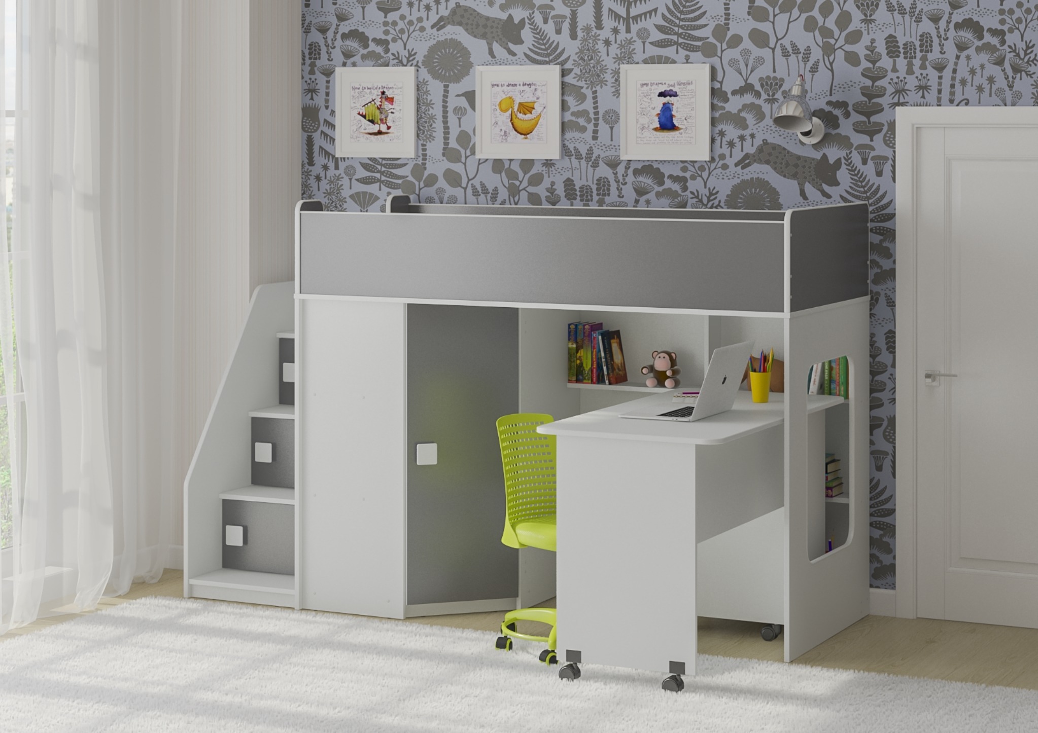 Хорошая многофункциональная кровать-чердак со встроенным шкафом, игровой зоной и столом на колесах. Точно стоит своих денег.
