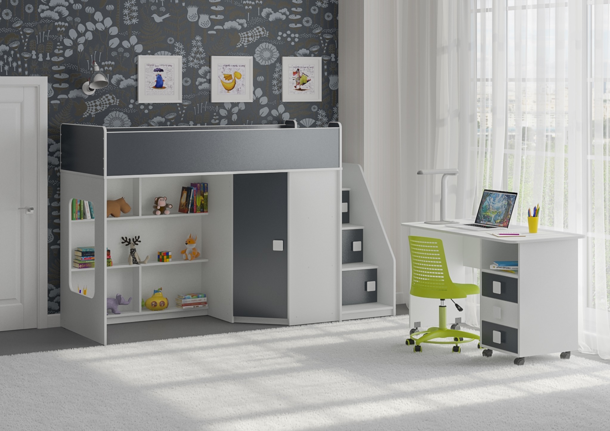 Внизу располагается игровая зона с полками – свой уголок для ребенка.