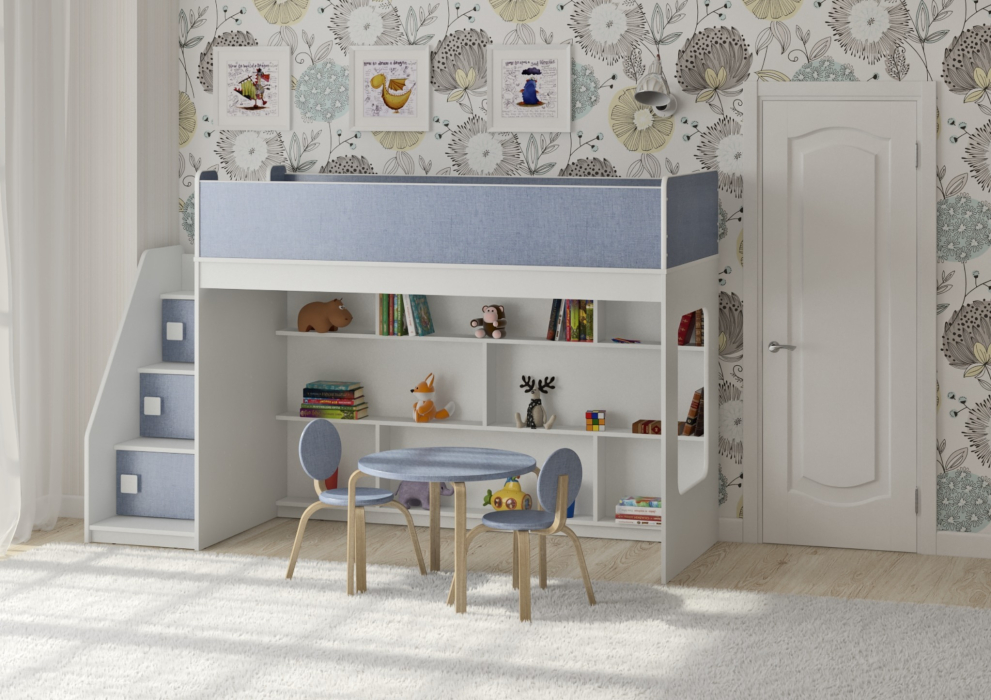 Внизу располагается игровая зона с полками – свой уголок для ребенка.