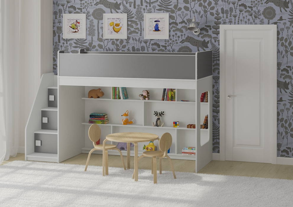 Внизу располагается игровая зона с полками – свой уголок для ребенка.