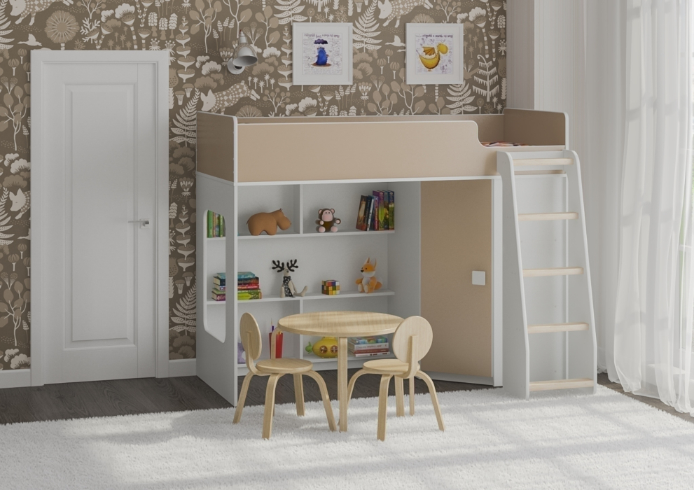 Внизу располагается игровая зона с полками – свой уголок для ребенка.