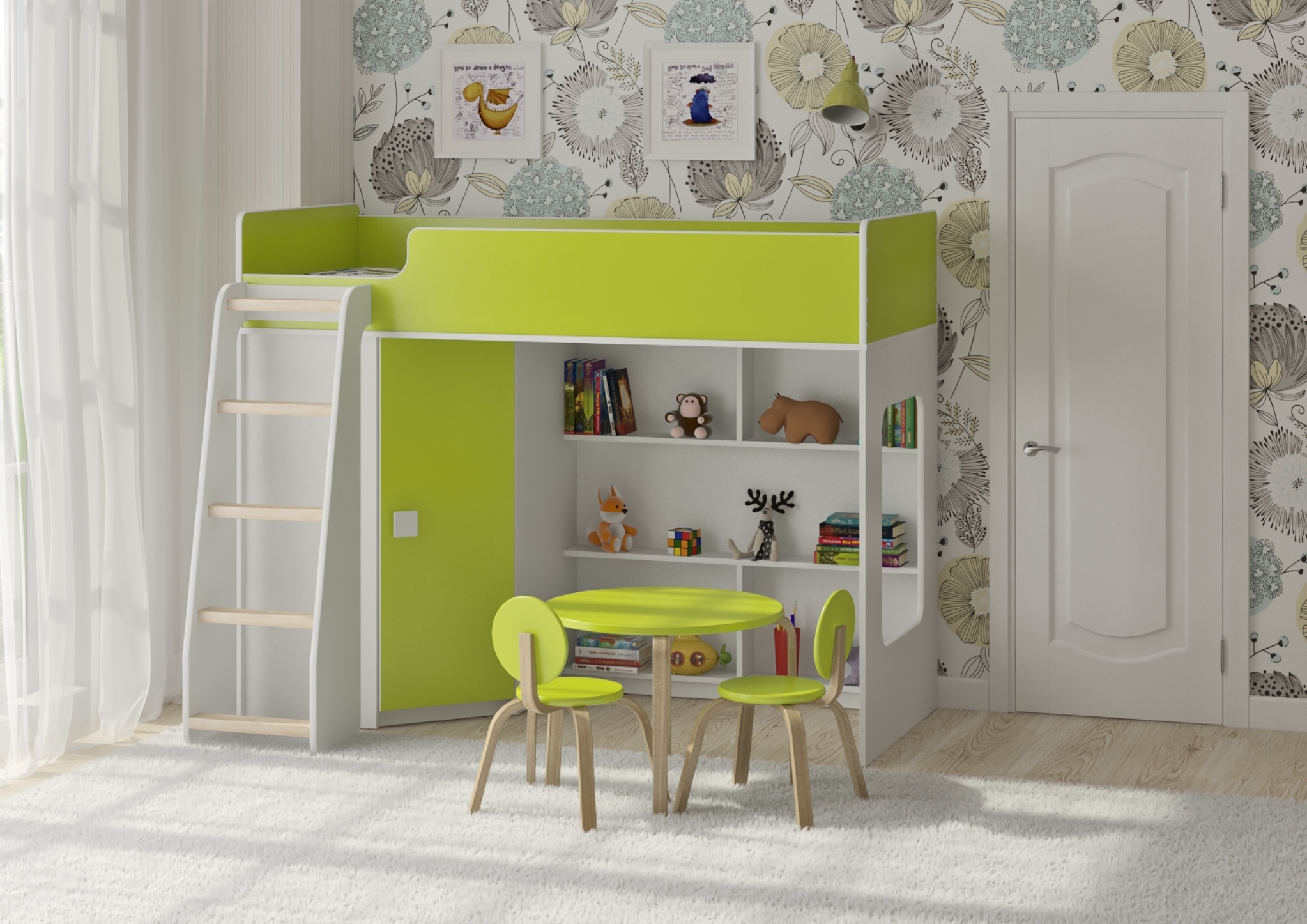 Внизу располагается игровая зона с полками – свой уголок для ребенка.