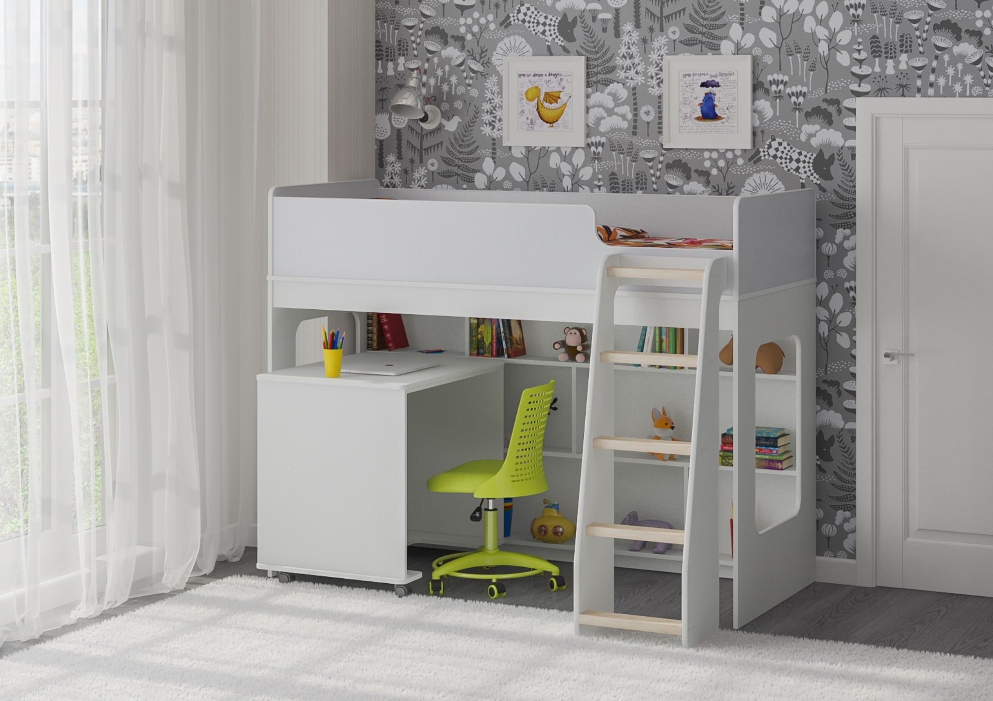 Внизу располагается игровая зона с полками – свой уголок для ребенка.