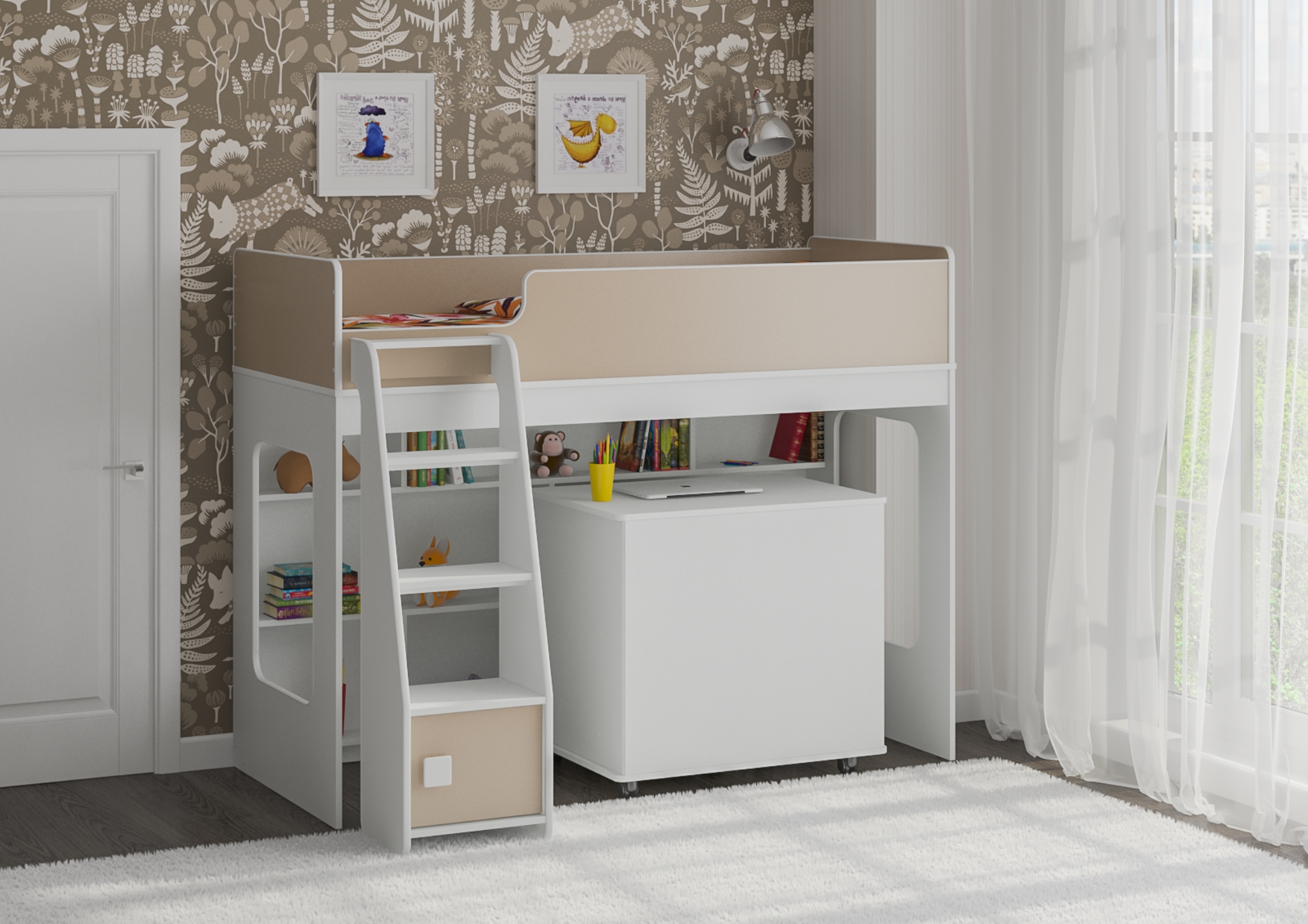 Внизу располагается игровая зона с полками – свой уголок для ребенка.