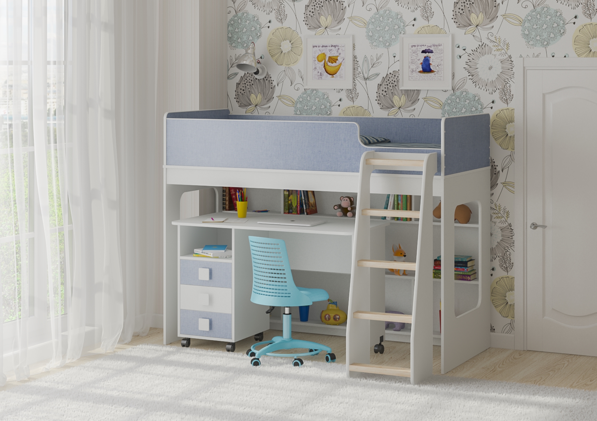 Внизу располагается игровая зона с полками – свой уголок для ребенка.