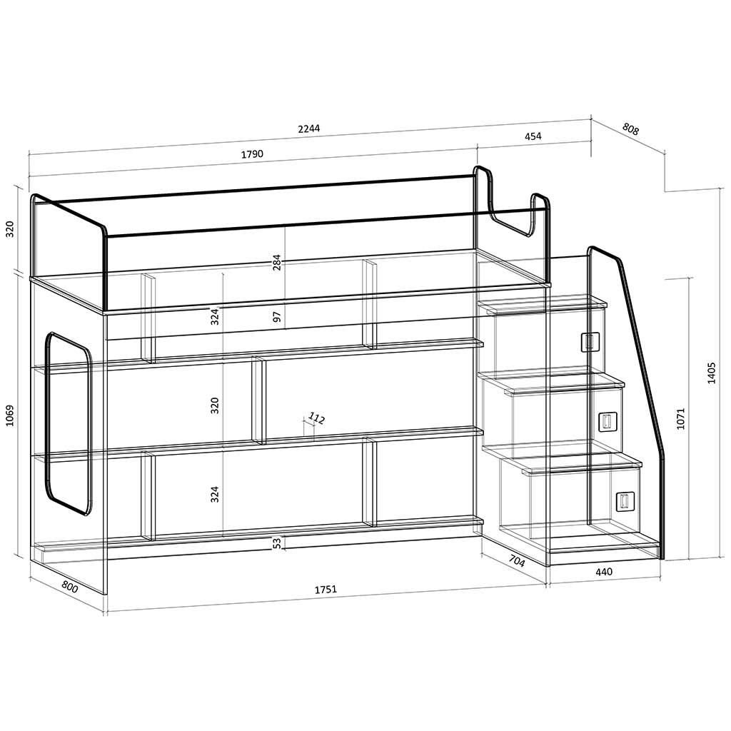 Высота кровати чердака всего 1405 мм, что легко позволит взрослым наблюдать за ребенком на кровати или достать что-то с верхнего яруса.