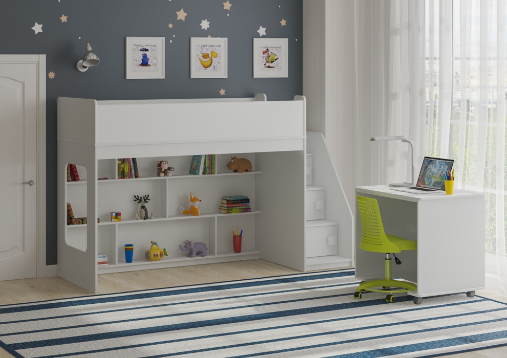 Внизу располагается игровая зона с полками – свой уголок для ребенка.