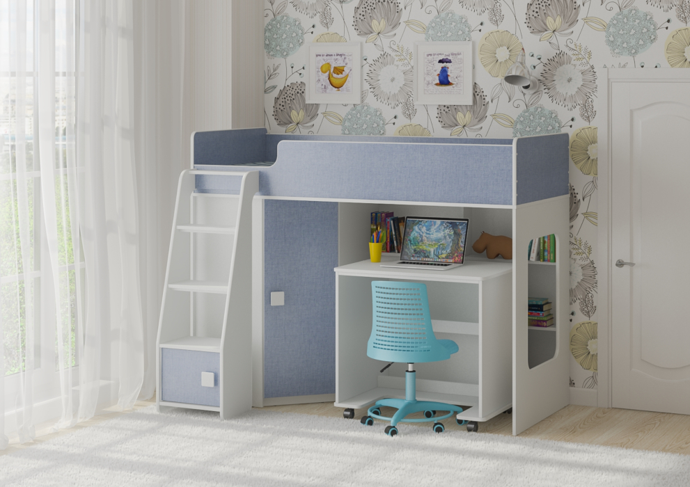 Кровать чердак Легенда 42.2.6 (Белый/Лен голубой)