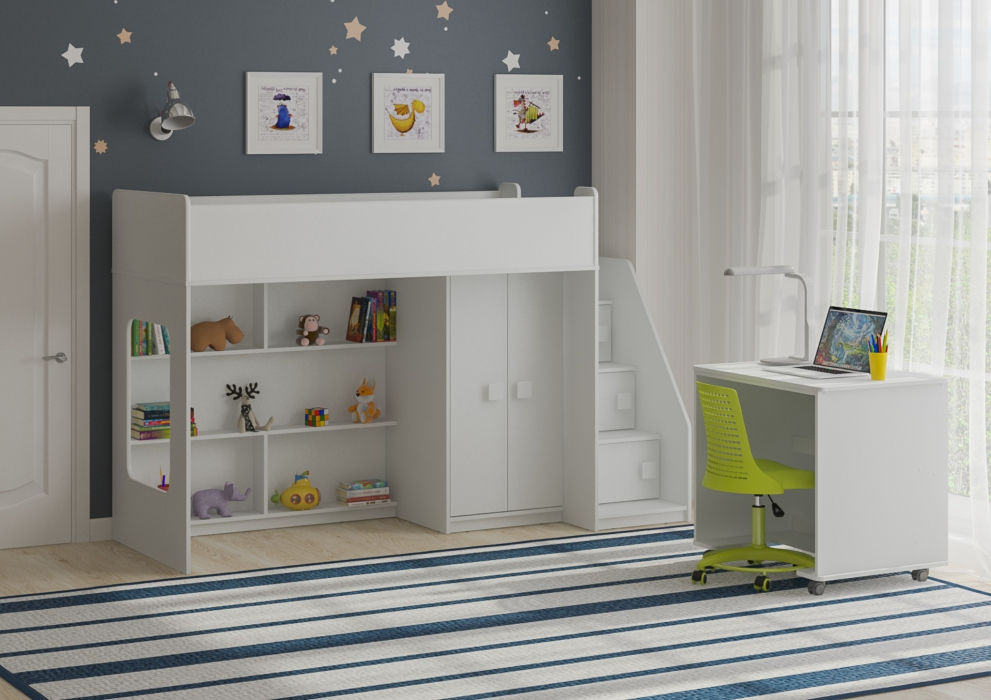 Высота кровати чердака всего 1405 мм, что легко позволит взрослым наблюдать за ребенком на кровати или достать что-то с верхнего яруса.