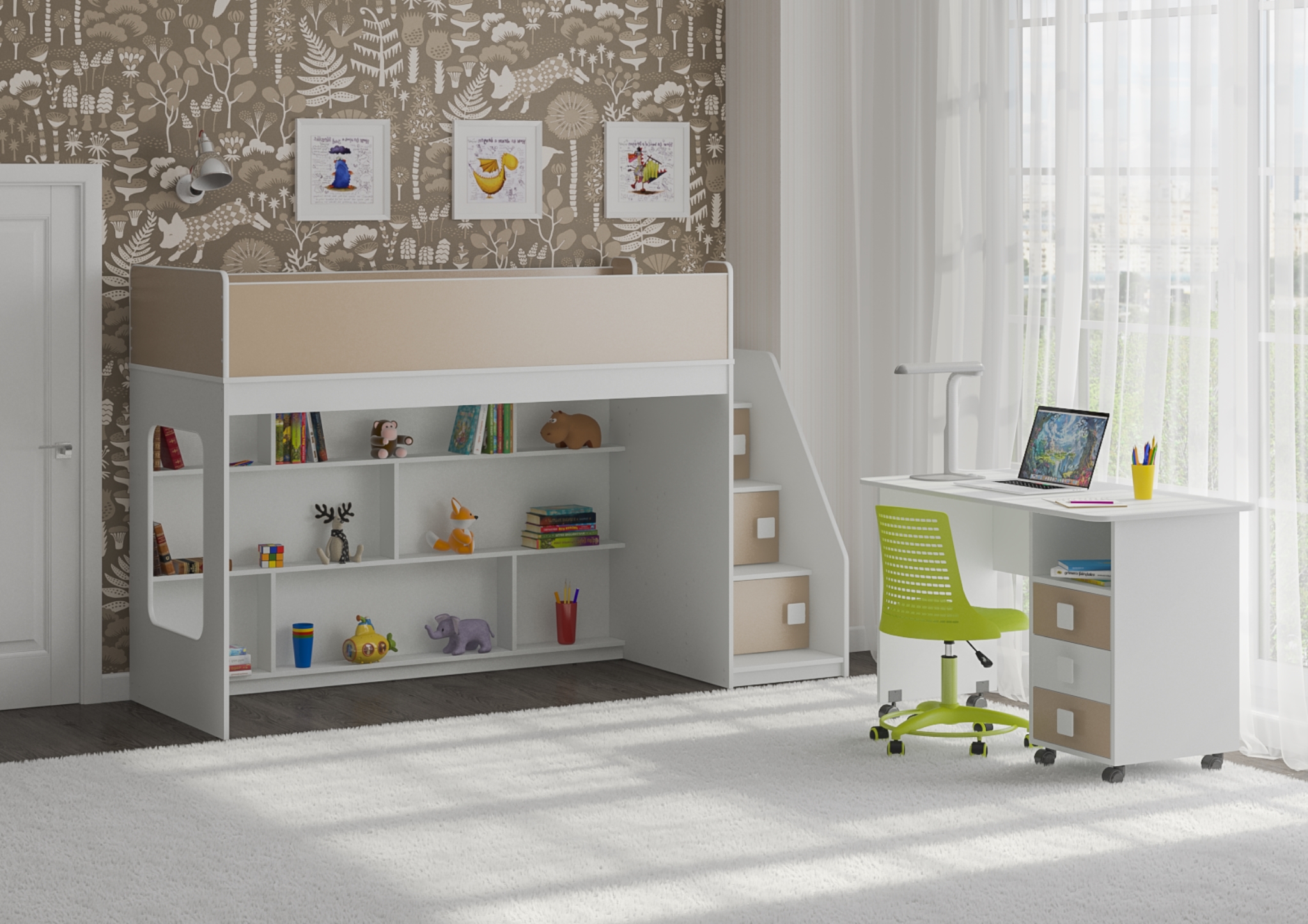 Внизу располагается игровая зона с полками – свой уголок для ребенка.