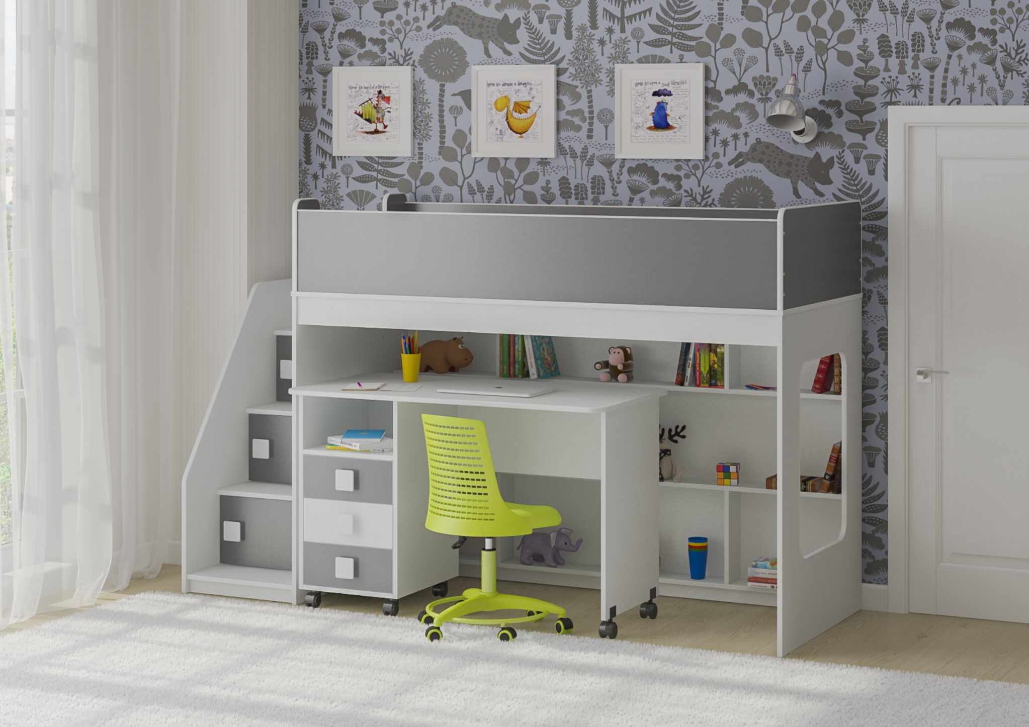 Внизу располагается игровая зона с полками – свой уголок для ребенка.