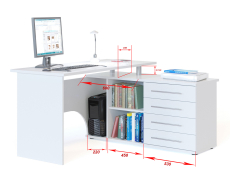 Стол оборудован тумбой с четырьмя ящиками на роликовых направляющих, открытыми полками и нишей под системный блок. Такая модель компьютерного стола позволяет организовать функциональную рабочую зону как в домашнем кабинете, так и в офисе.