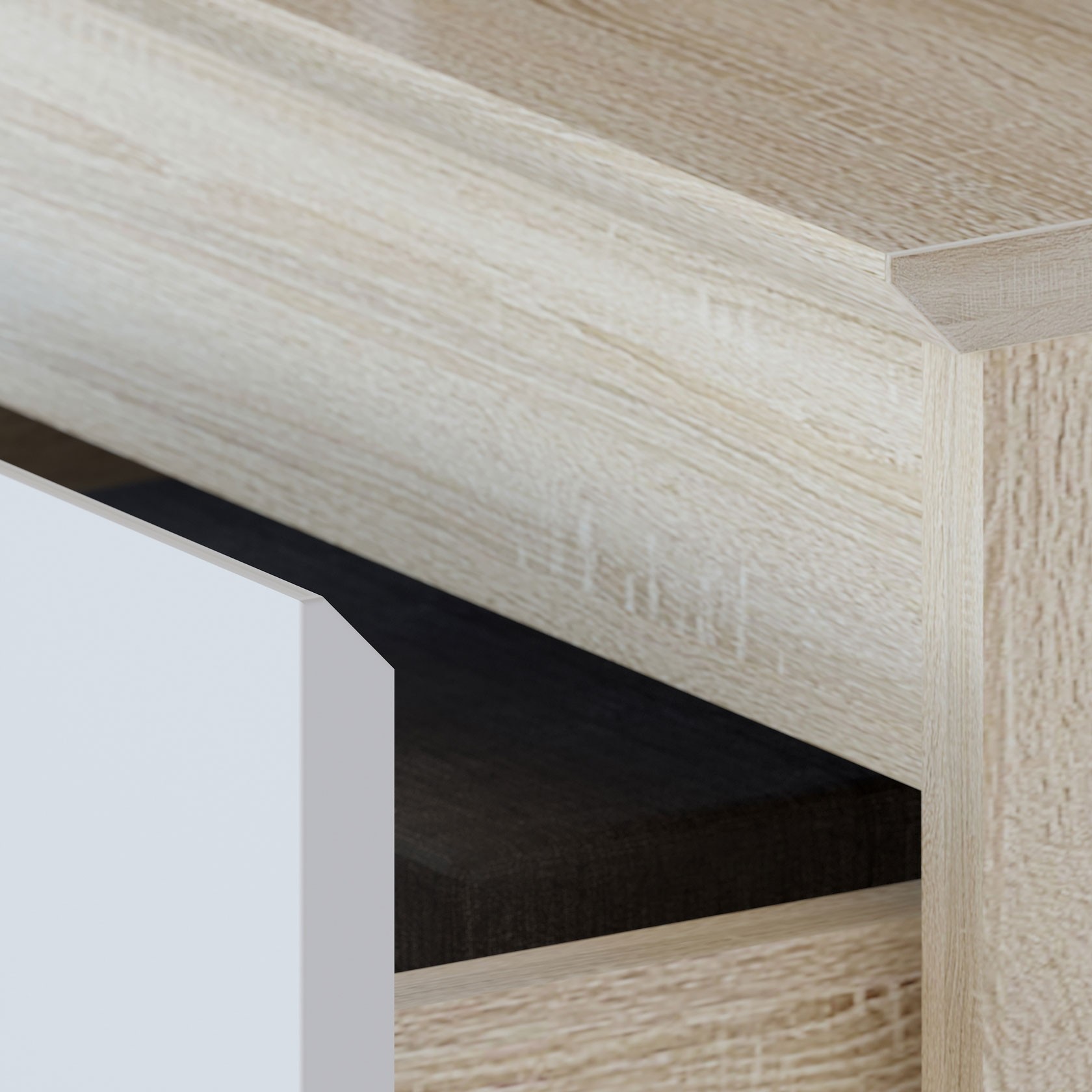 удобное хранение — три вместительных выдвижных ящика дополнены распашным отделением с полочкой, а на широкой столешнице поместится небольшой телевизор, аксессуары, предметы декора;
