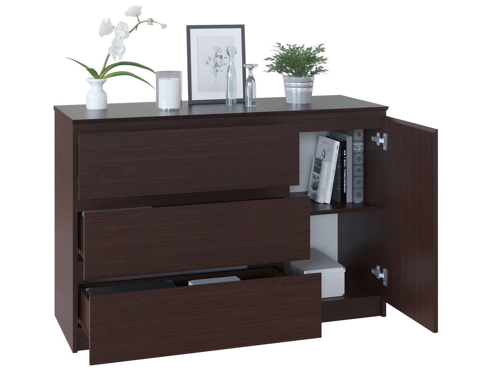 Для изготовления комода используется ЛДСП толщиной 16 мм. Задняя стенка и дно ящиков произведены из ДВП. Модель оснащена роликовыми направляющими.