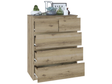 Для изготовления комода используется ЛДСП толщиной 16 мм. Задняя стенка и дно ящиков произведены из ДВП. Модель оснащена роликовыми направляющими.
